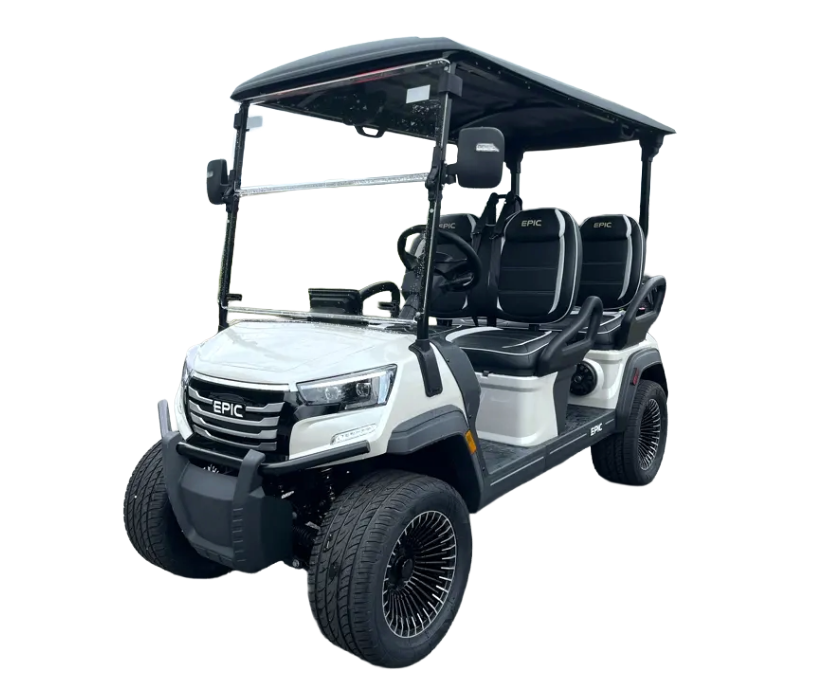 The brand new Epic E40FX is the best golf cart on the market today! Furnished with every imaginable feature, the forward-facing four-seater Epic E40FX comes in six stylish colors and two height options. Premium 14” wheels and street-ready tires provide a solid foundation for every journey on every terrain, no matter what lift height is selected. With an abundance of storage, superior built-in marine-grade sound system and speakers, and stunning accent lighting, this Epic E40FX golf cart illuminates the possibilities for fun and adventure.